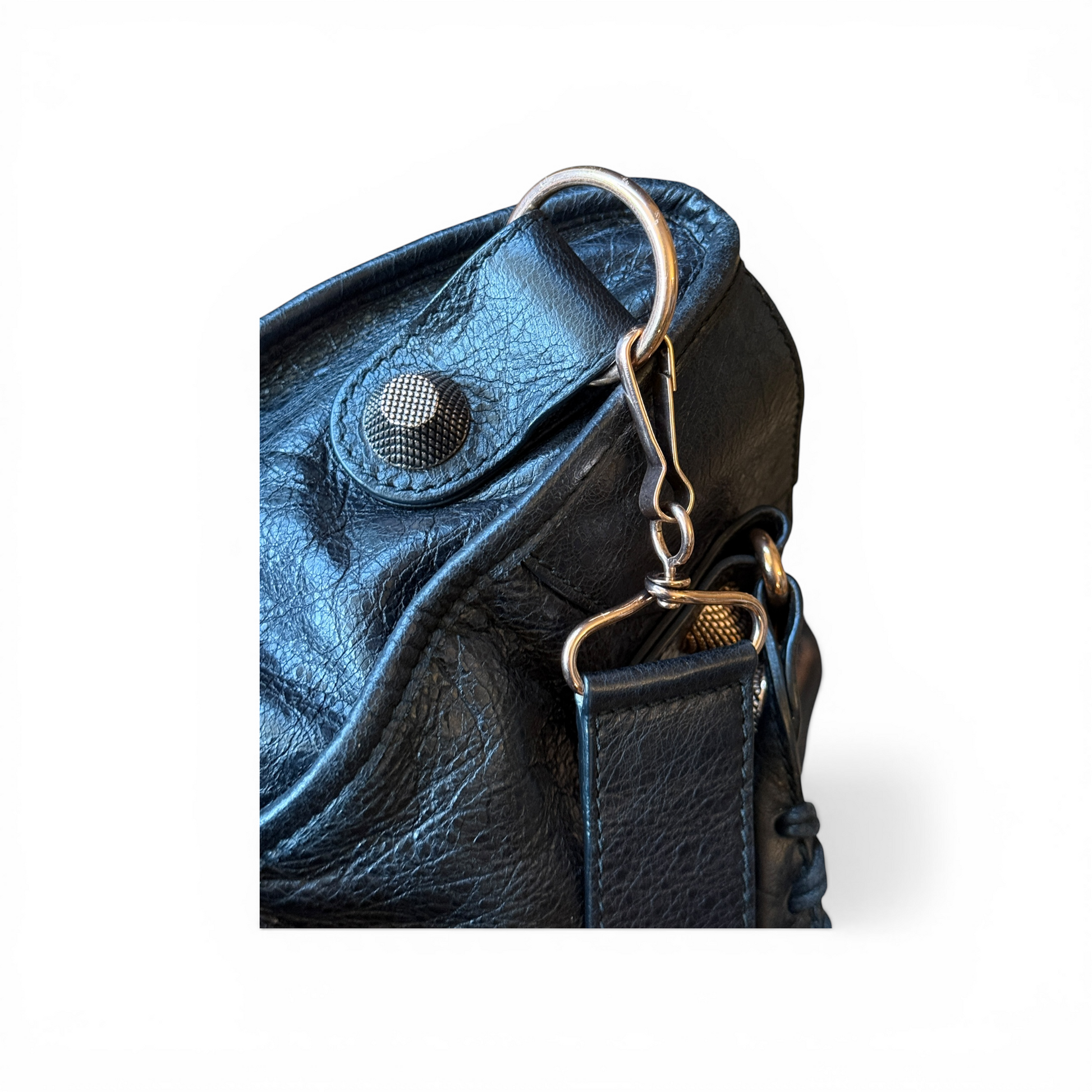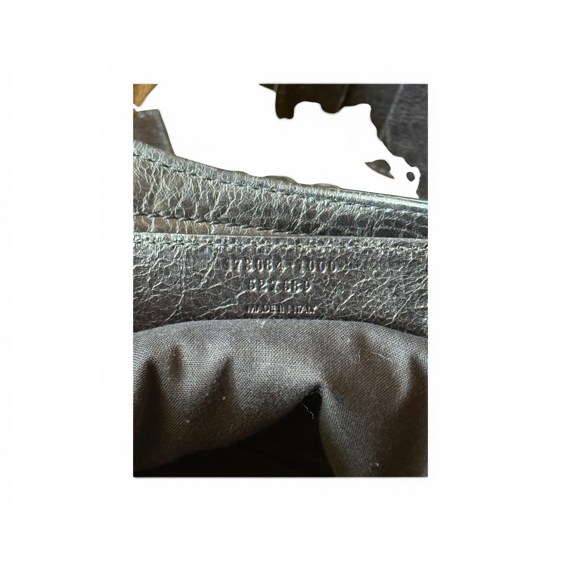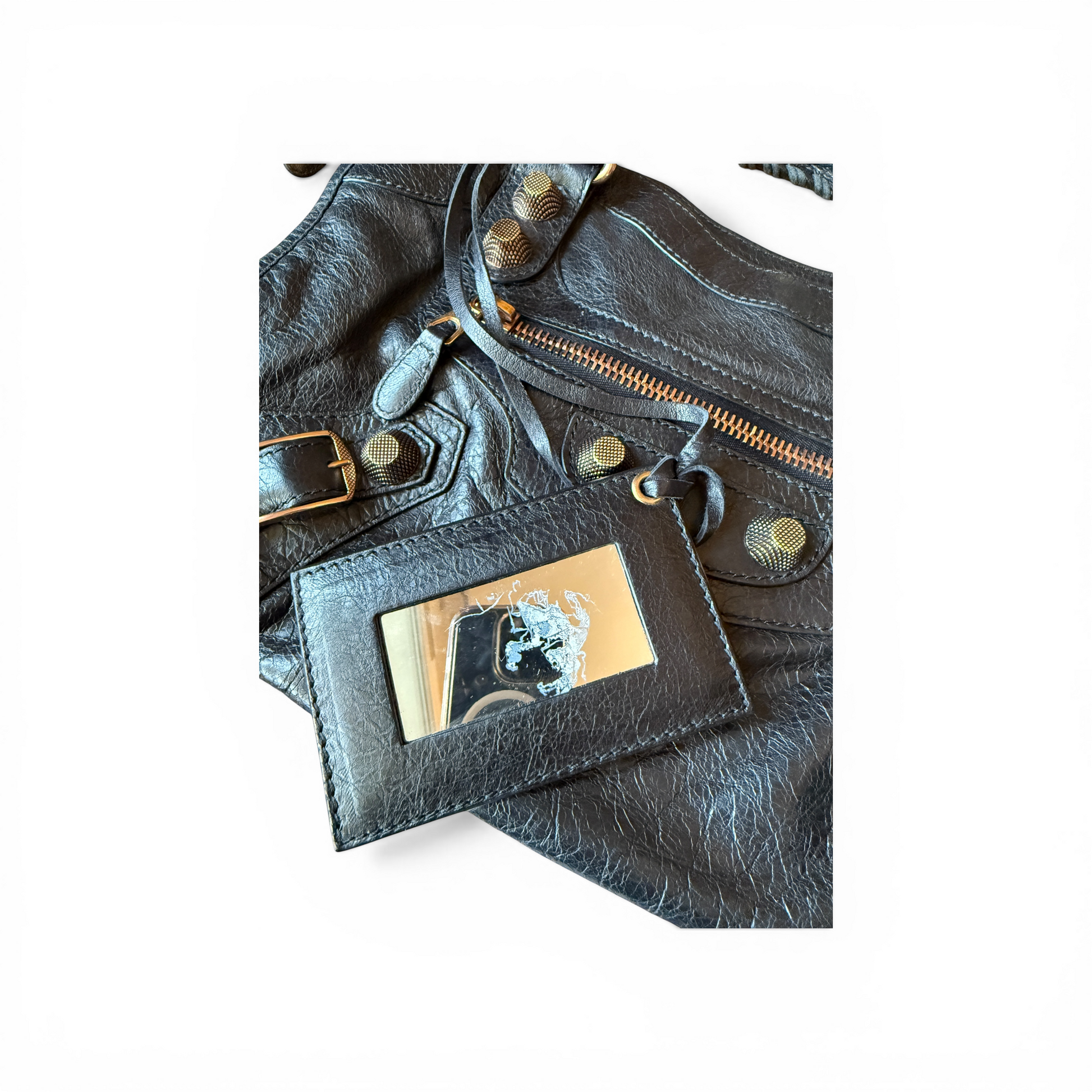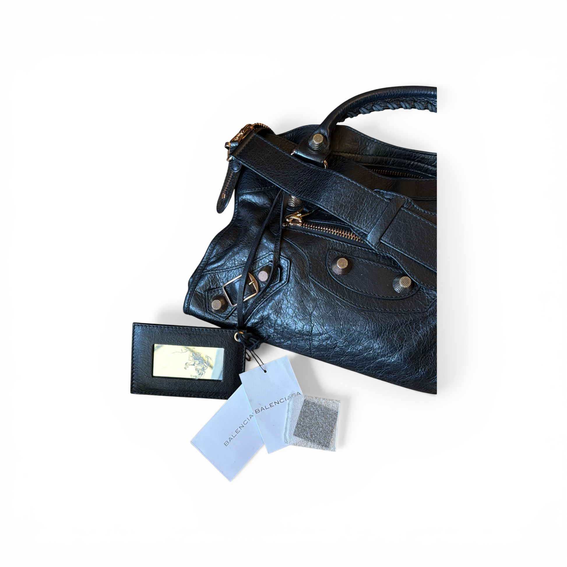 Le sac est également accompagné des étiquettes Balenciaga ainsi que d’un morceau de cuir supplémentaire fourni par la marque, permettant une éventuelle réparation du cuir si nécessaire.