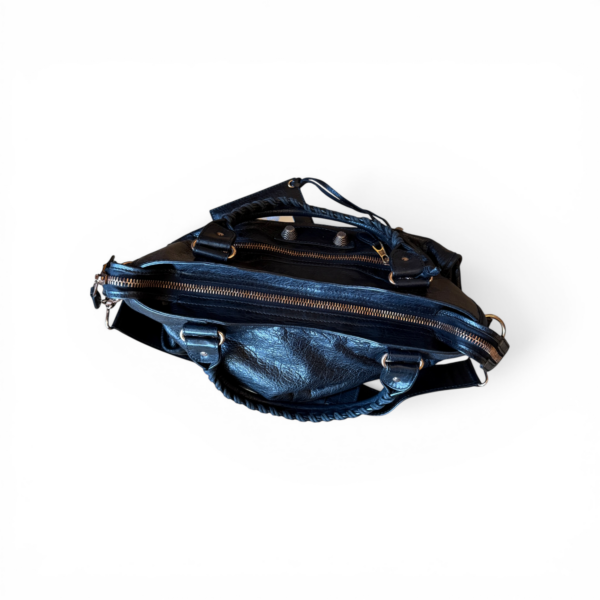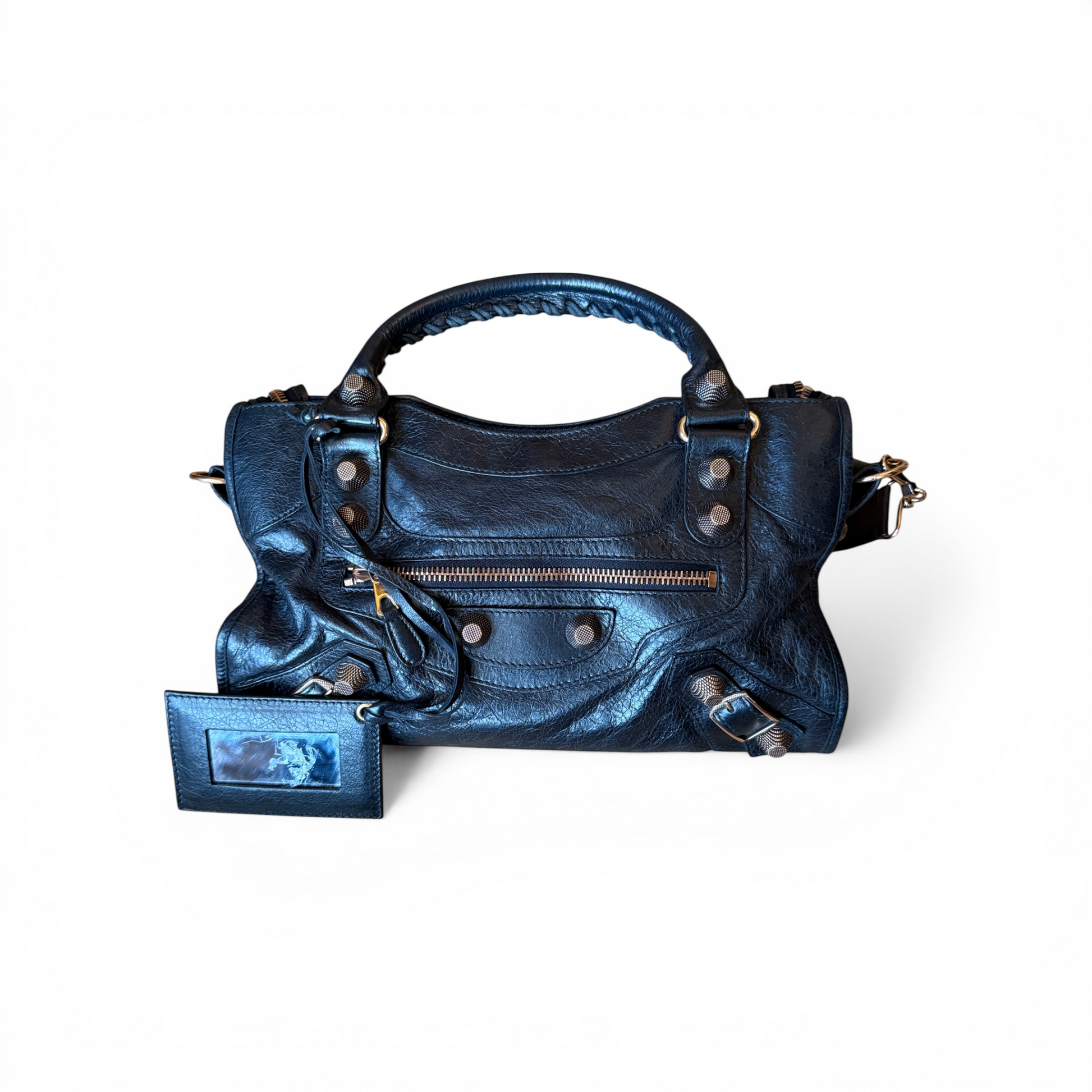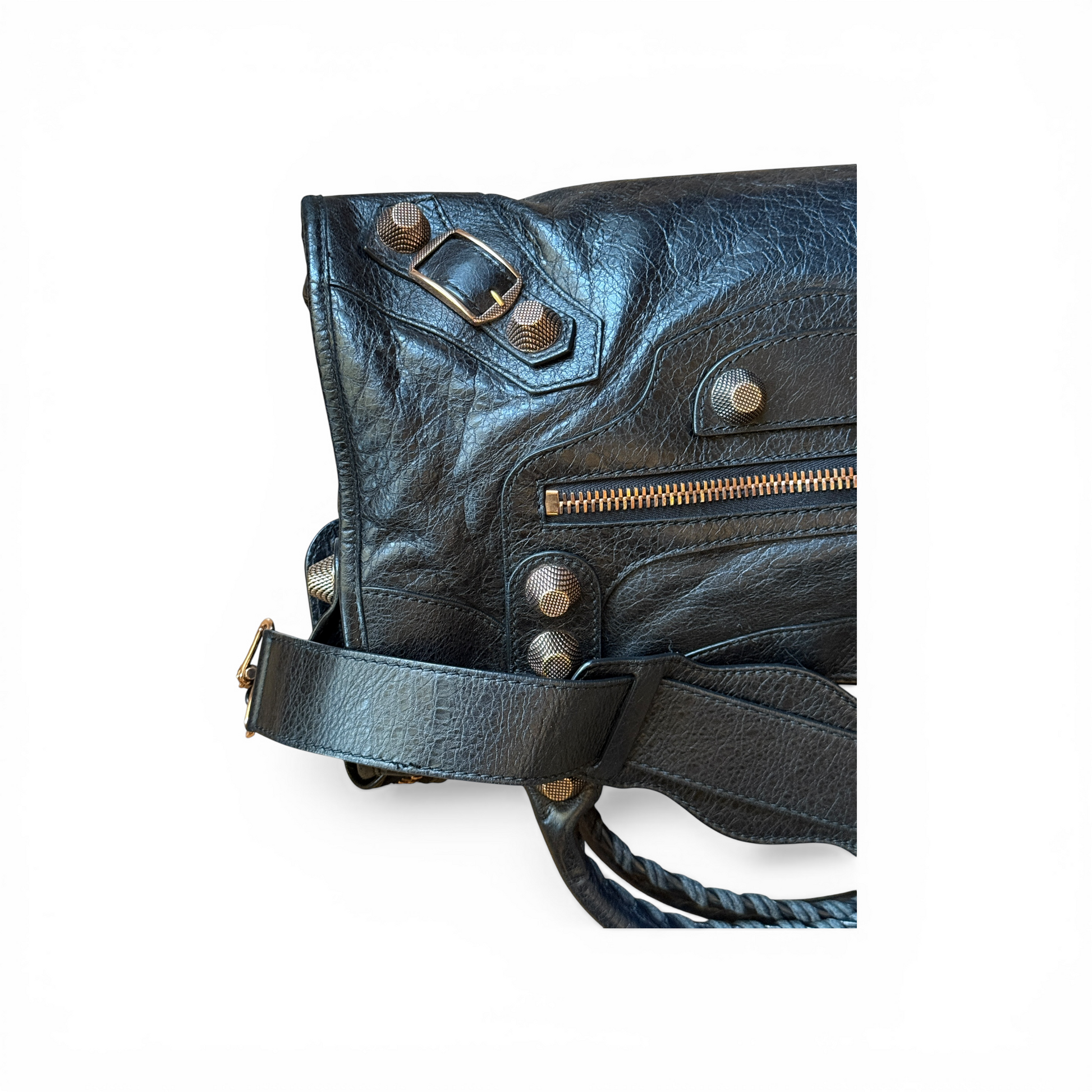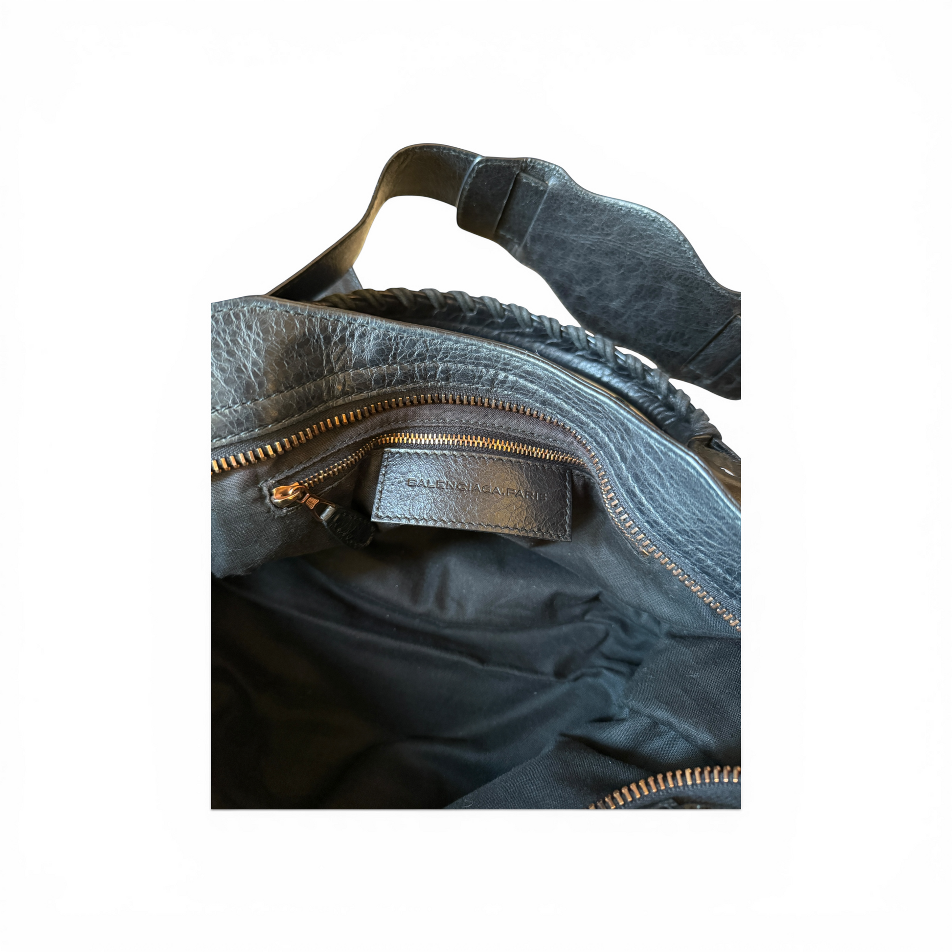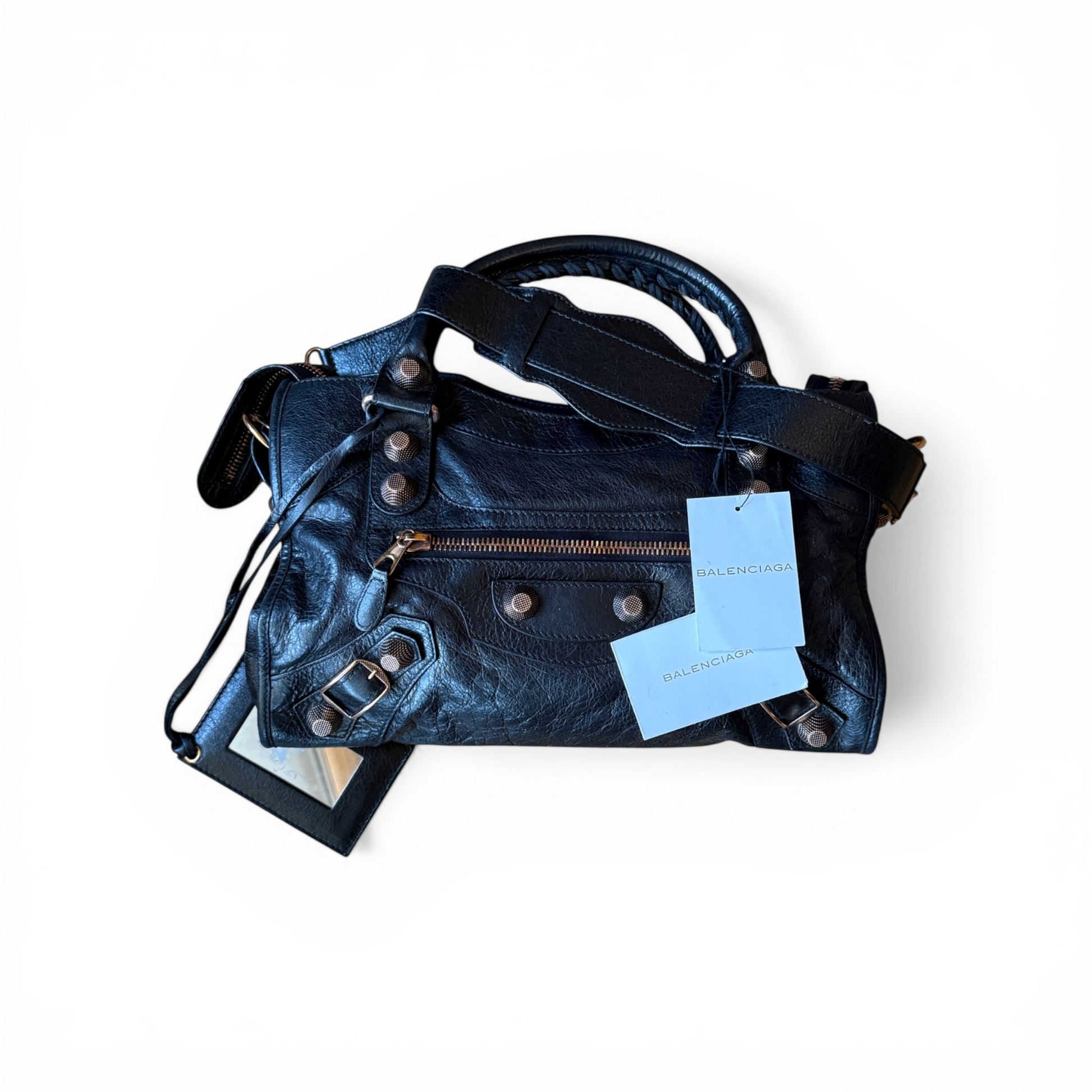 Le sac est également accompagné des étiquettes Balenciaga ainsi que d’un morceau de cuir supplémentaire fourni par la marque, permettant une éventuelle réparation du cuir si nécessaire.