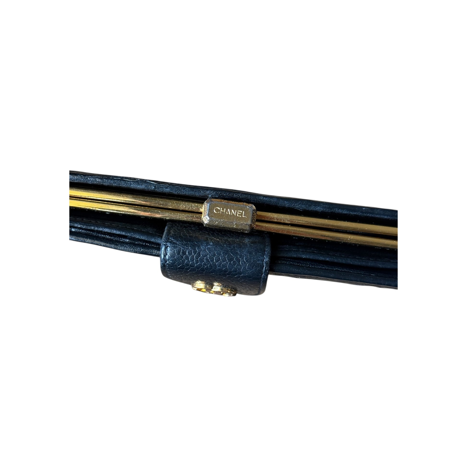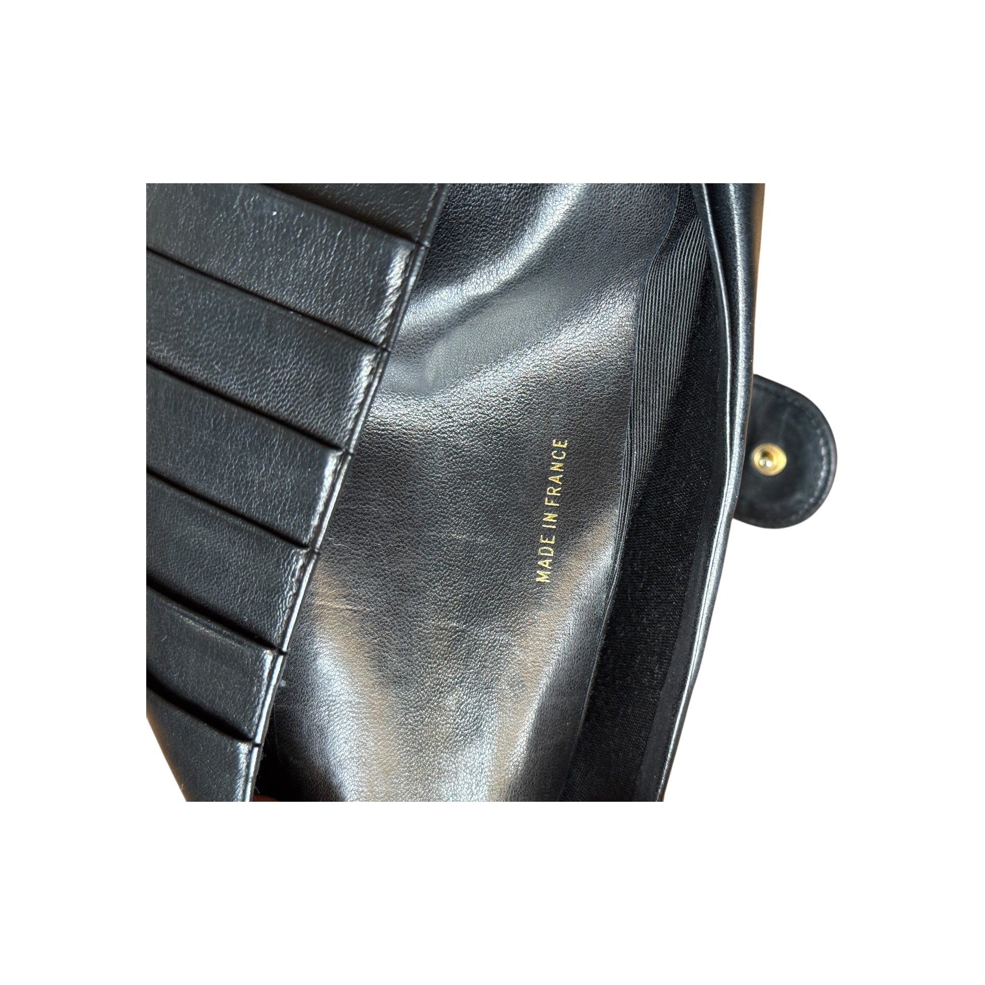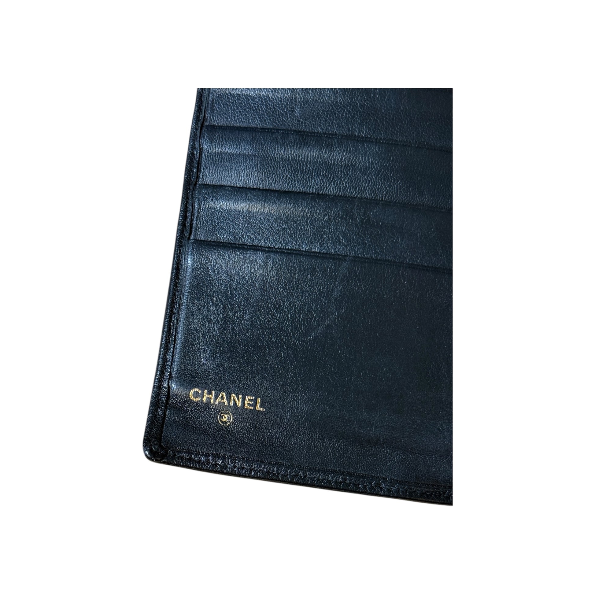 Portefeuille Chanel noir en cuir. Présence de deux compartiments intérieurs. À noter : bouton pression défectueux nécessitant une réparation. Vendu avec sa boîte d’origine.