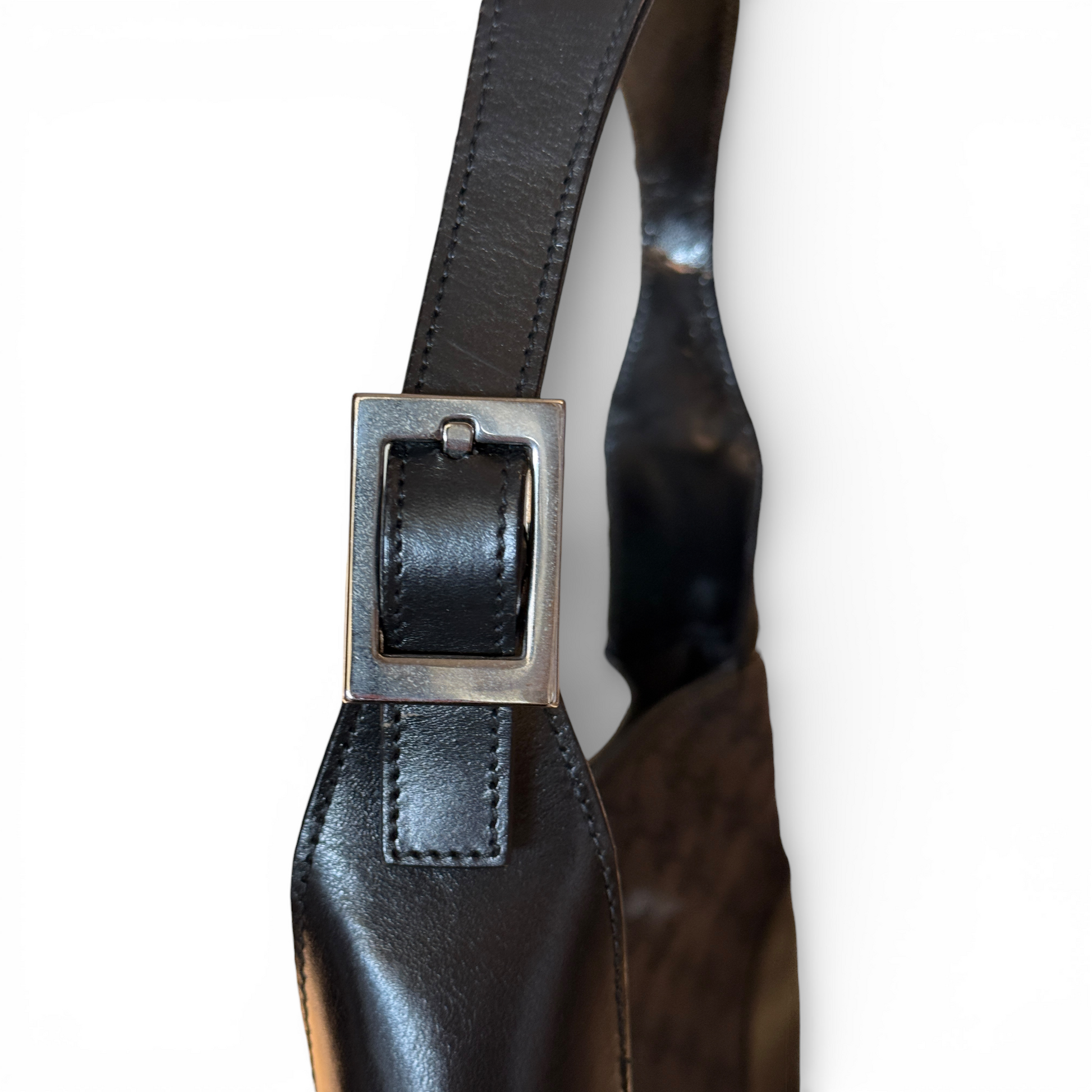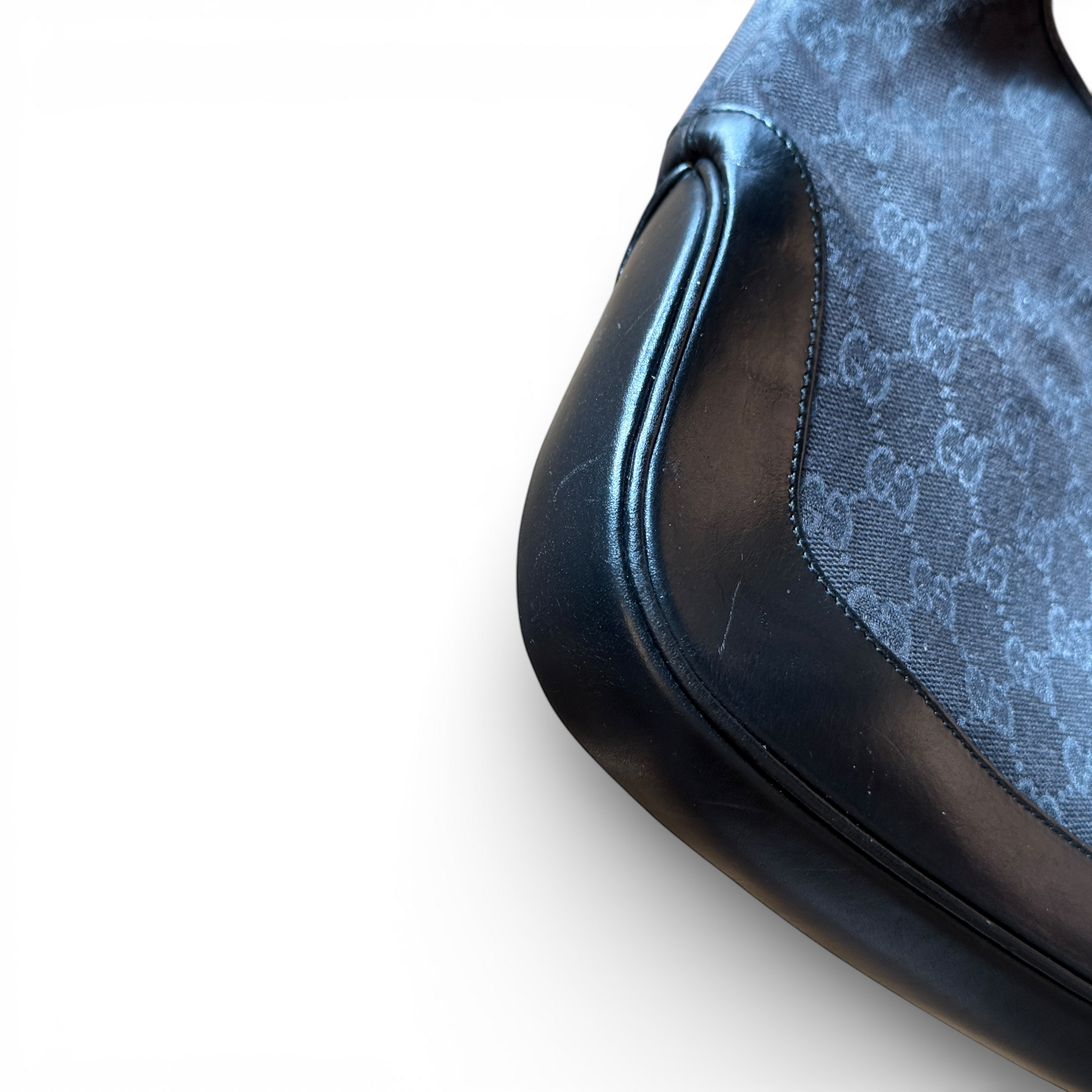 Sac en bon état général. La toile présente de légères marques d’usure, discrètes et peu visibles. Les parties en cuir noir sont légèrement griffées. Le sac a été réparé, réparation peu visible (voir photo 4).