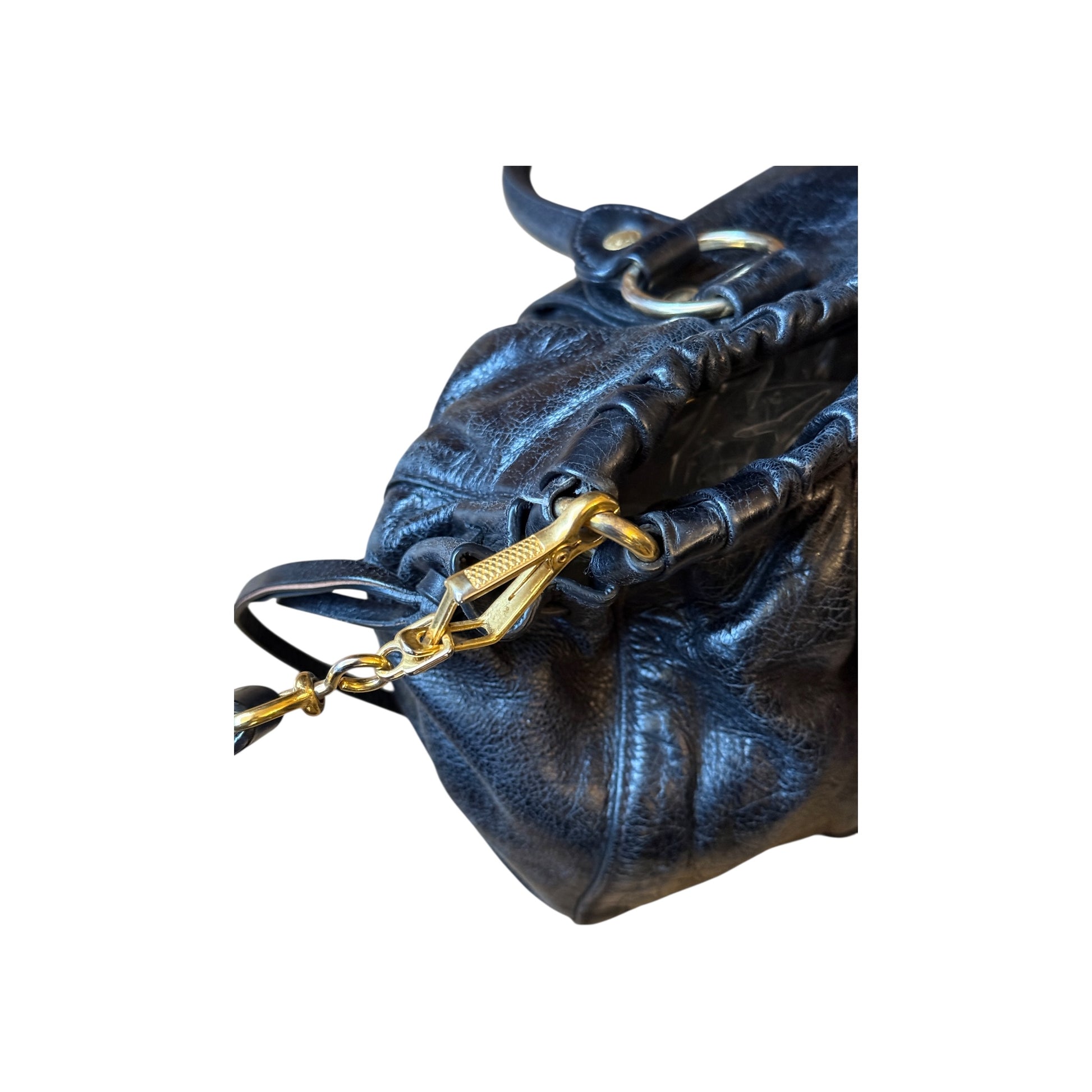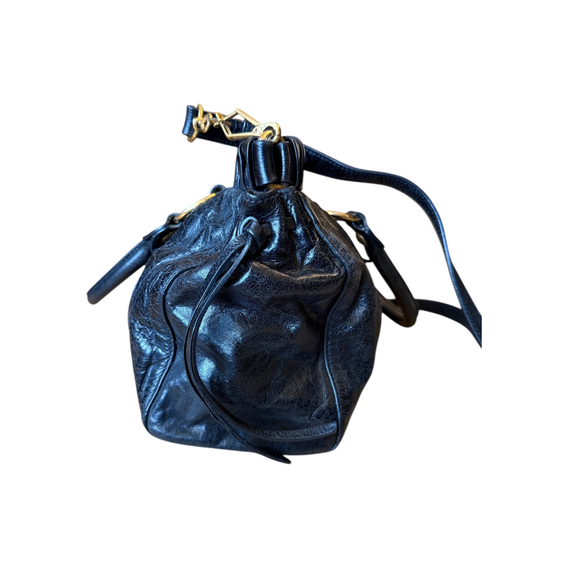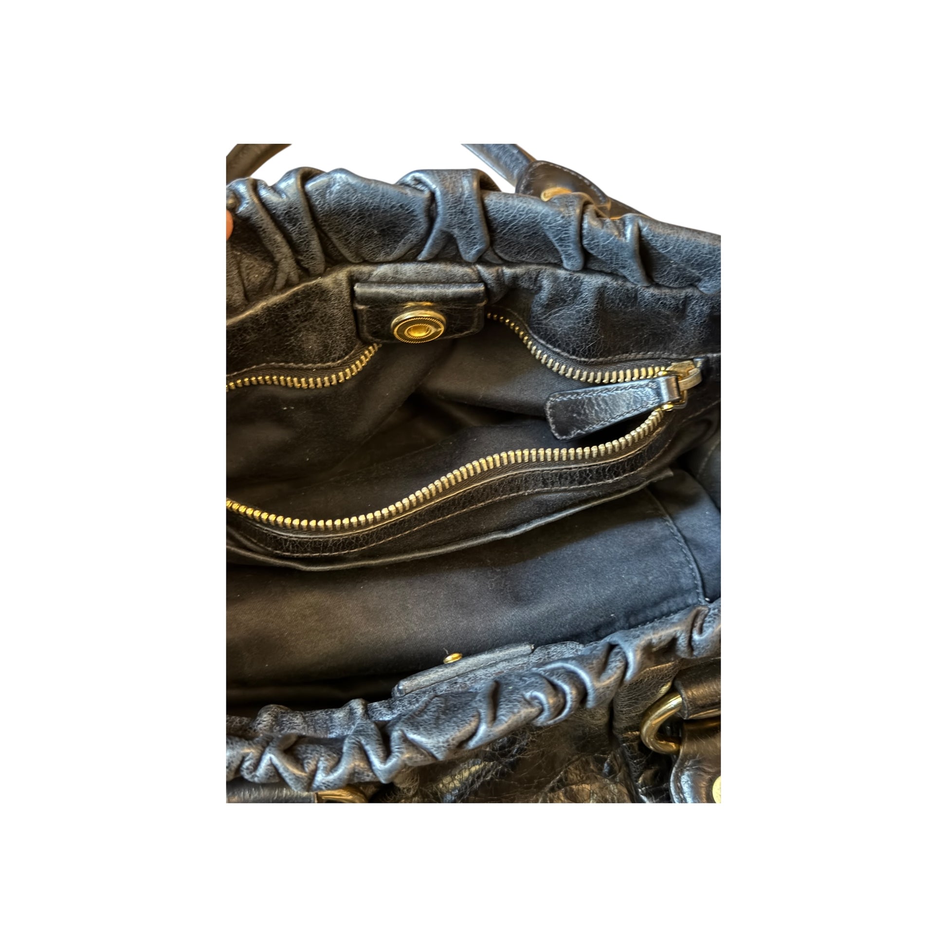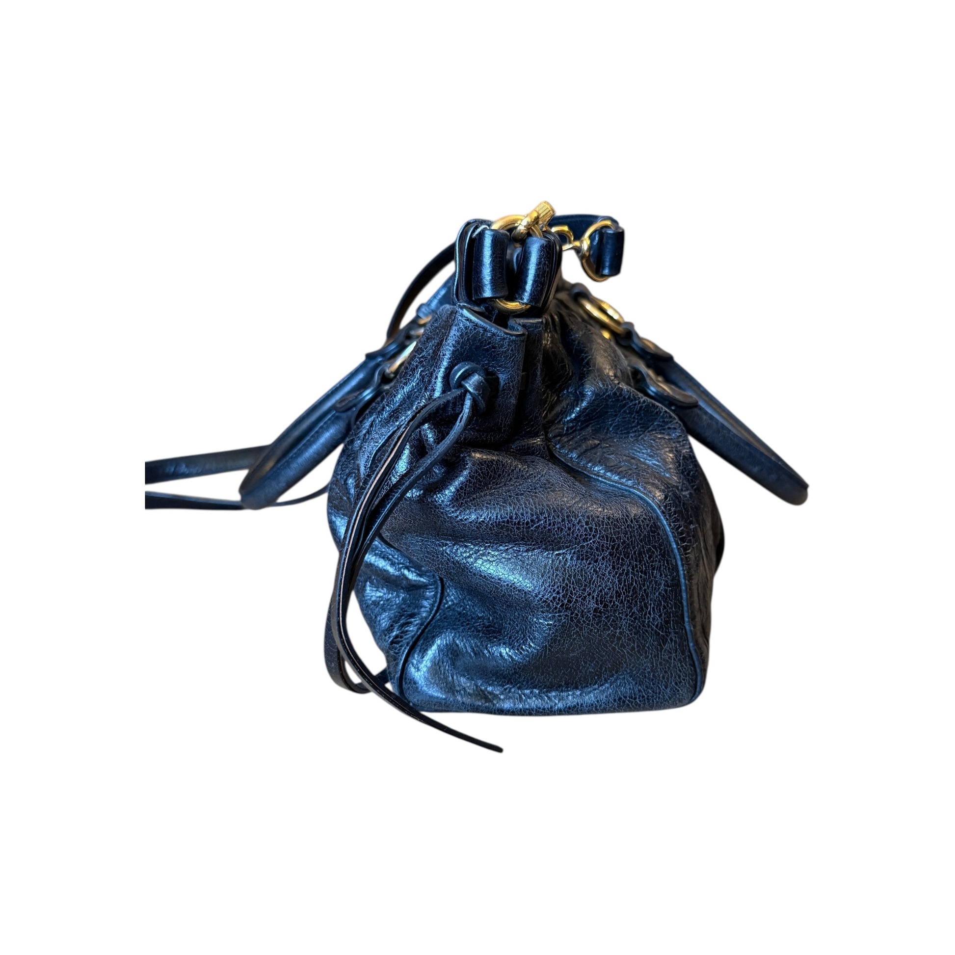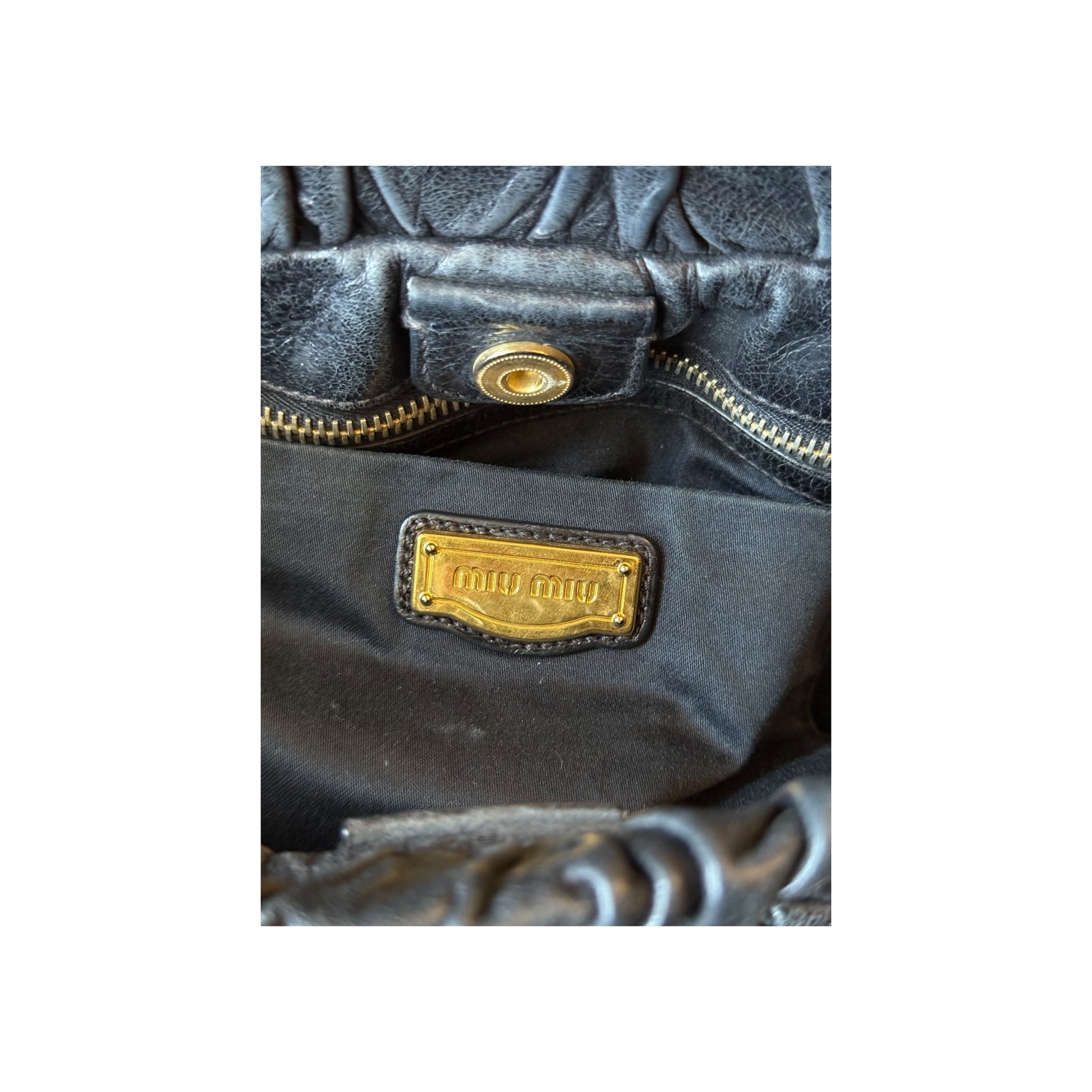 Sac Miu Miu en cuir vitello noir (cuir de veau), porté bandoulière. Le cuir présente une légère usure liée à l’utilisation, sans rien de gênant ni d’altérer l’esthétique du sac.