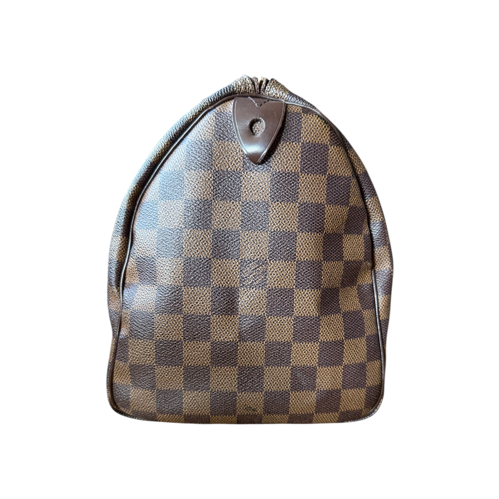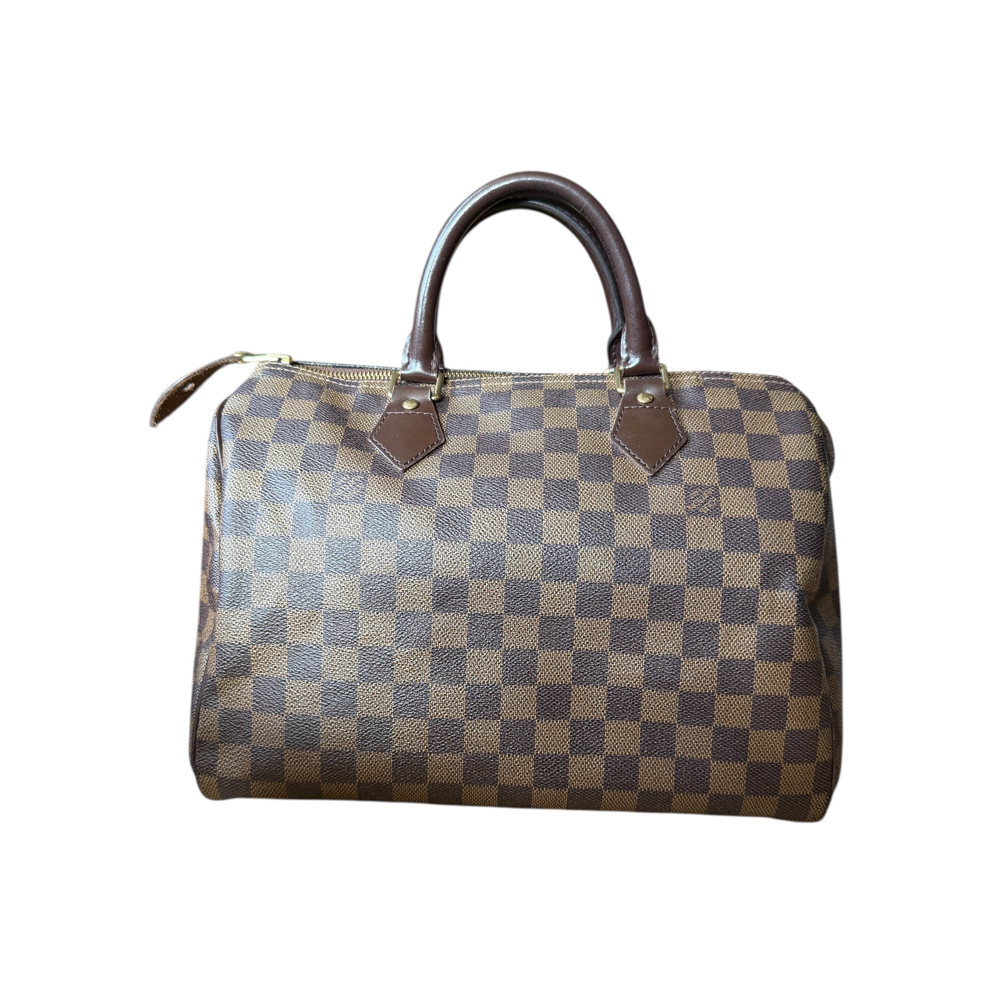 Modèle Speedy 30 en toile Damier Ébène avec intérieur en textile rouge. Sac en très bon état général. À noter : absence de cadenas.